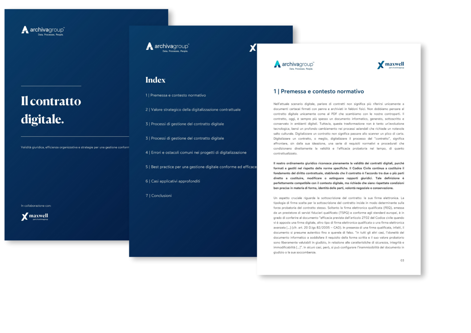 - Disponibilità e ricercabilità dei documenti contrattuali (dematerializzazione, archiviazione, metadatazione).